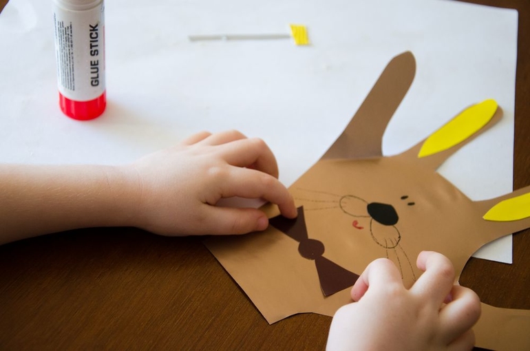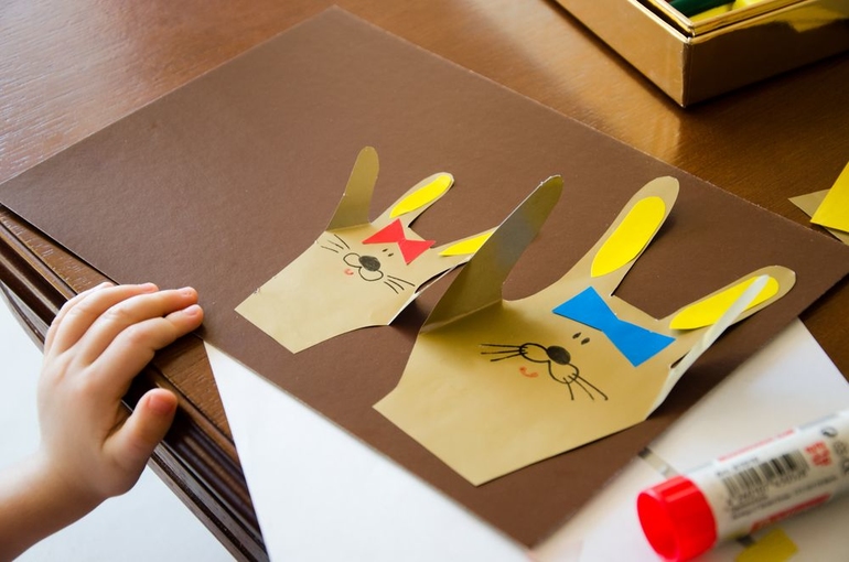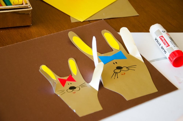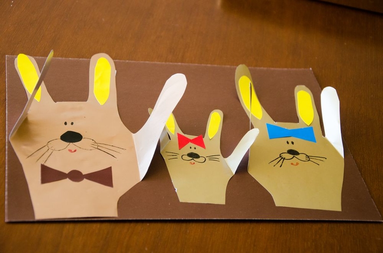 6. А этот вариант вообще мало с полосками связан, но это наша любимая поделка - зайчики из ладошек). Поэтому пока их сюда помещаю. Ладошки обводим и вырезаем вместе.