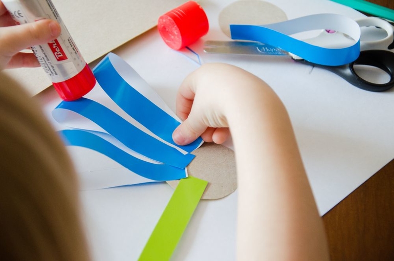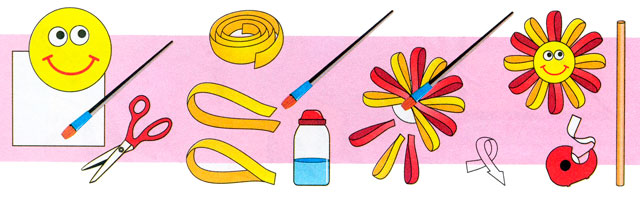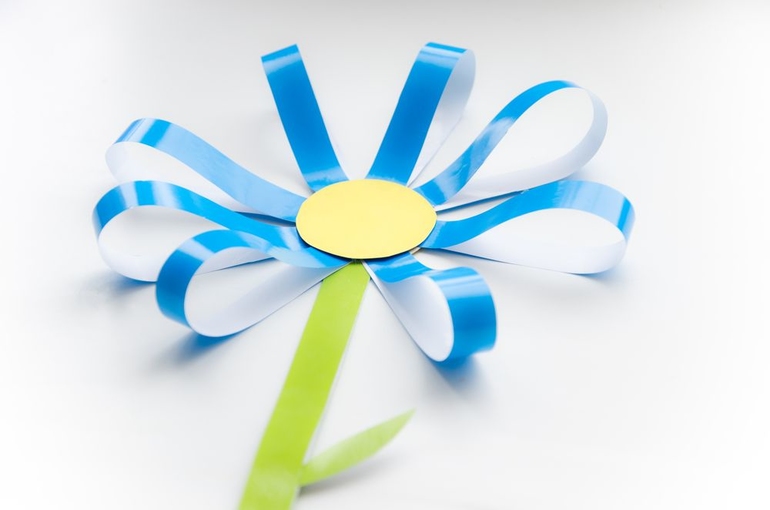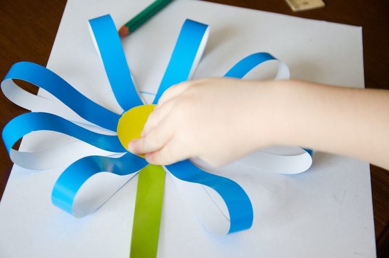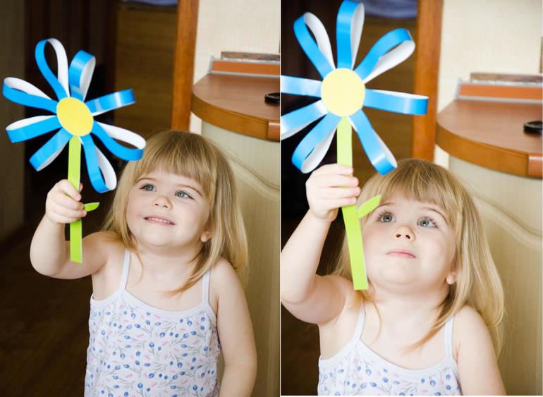 3. Есть очень-очень много вариантов из полосок, чтобы сделать цветочек. Мы испробовали простой. В этот раз Настя любезно позволила мне пофотать процесс. Все очень просто - вырезаем 2 кружочка - это серединки. Мы просто обвели стакан, я вырезала кружочки. Полоски - лепестки нарисовала заранее, Настя их разрезала. Потом приклеиваем на один из кружочков сложенную полоску и длинную полоску из картона - стебелек. Потом закрываем наши черновые работы другим кружочком. Получается красивый двусторонний цветок.