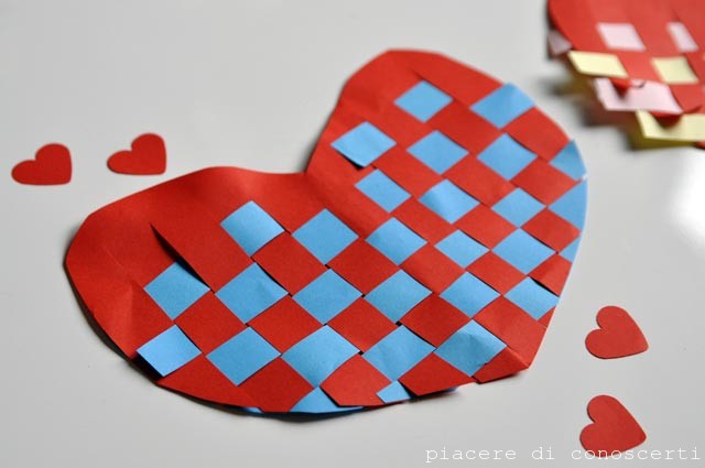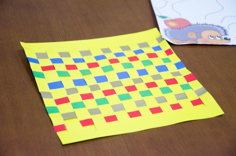 4. Вспомнила я начальные классы школы и решила с Настей коврик сделать из полосок. Конечно, вся работа для нее пока сложновата. Делали вместе. Настя нарезала основу и полоски. Я их продевала, она фиксировала клеем.