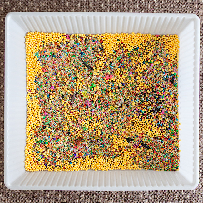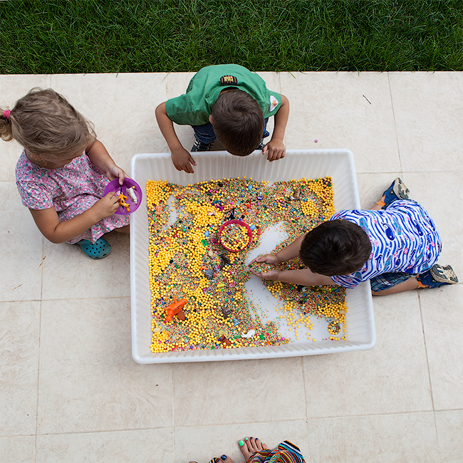 Делали много разных сенсорных коробок, в итоге ссыпали все в одну - и получилась одна большая песочница, в которой дети периодически искали какие-нибудь сокровища.