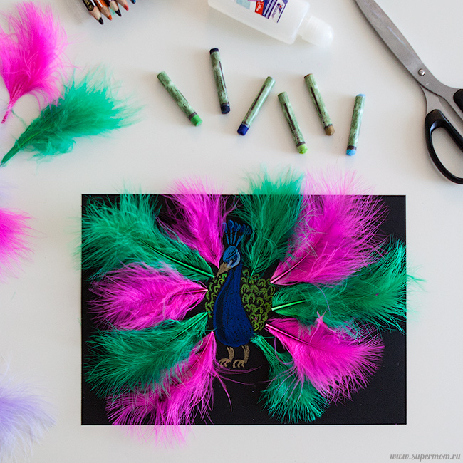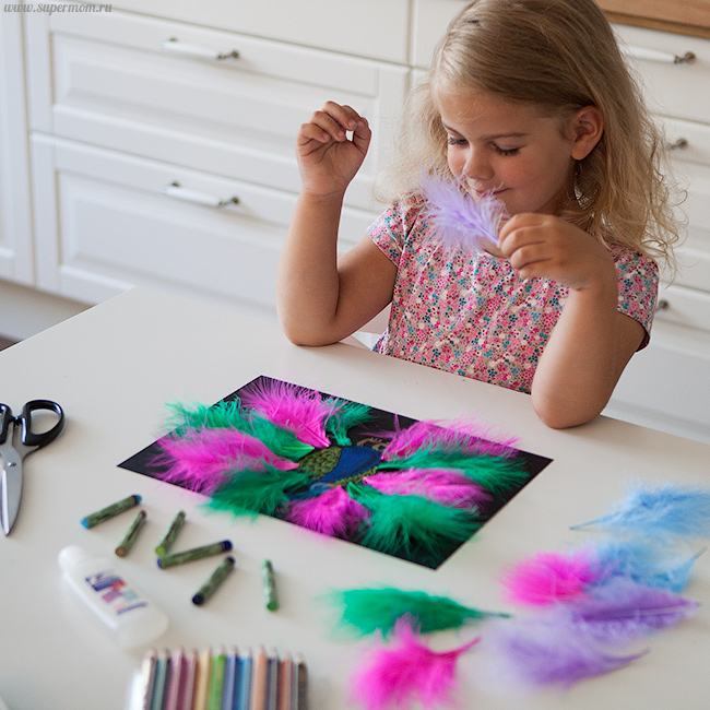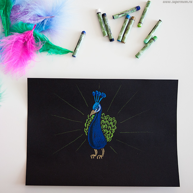 Бумага из набора Икея, масляная пастель (в Лабиринте, в Май-шопе, в Риде), перья (в Озоне, в Май-Шопе, в Риде)