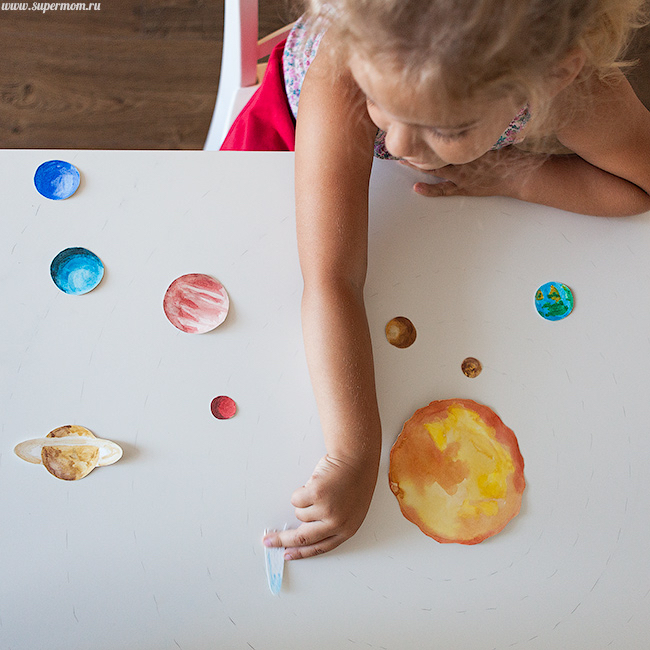 Потом мы всё вырезали и я за неимением ватмана прямо на столе нарисовала орбиты, на фото их плохо видно. Мы катали планеты по орбитам, а потом приклеили их на лист, сделав аппликацию.
