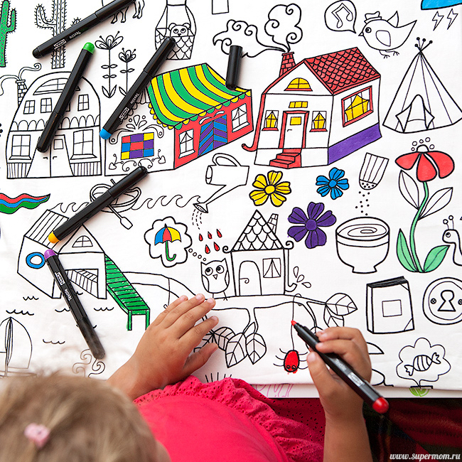 Еще из находок: у нас дома оказалась сумка, сшитая из ткани Икея, которую можно раскрашивать специальными фломастерами, которые продаются там же. Алисе так понравилась идея самой украсить себе вещь, что довольно долгое время я даже не убирала сумку со стола, она подходила и раскрашивала ее наскоками до тех пор, пока не раскрасила всю.