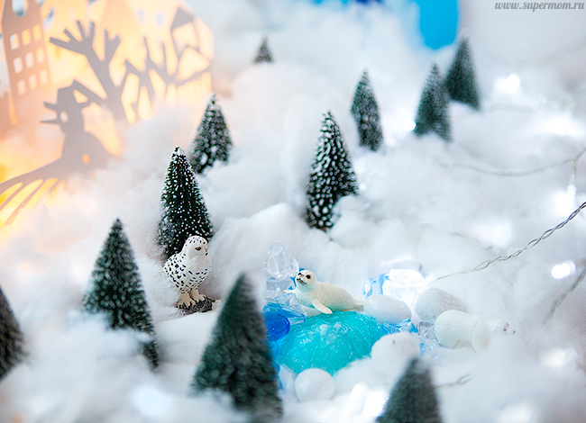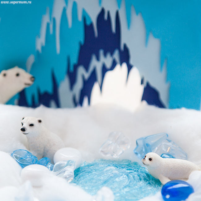 Первыми жителями оказались белёк и белые медведи от Шляйх. В качестве снега я использовала обычную вату, а Алиса сложила из нее "гнездо", куда мы поместили зверей и акриловый льдинки из фикс-прайса.