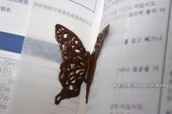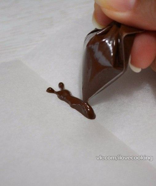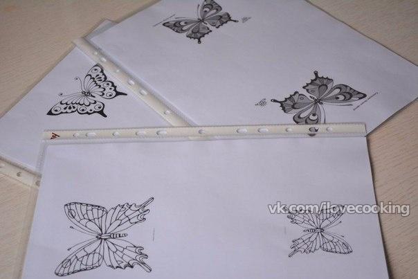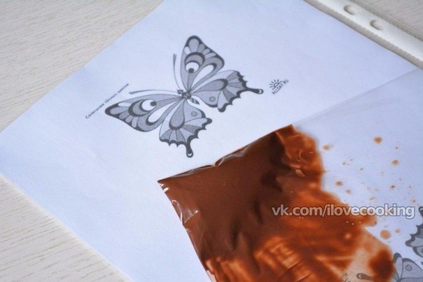 Растопленный шоколад подвигаем к уголку пакета, срезаем маааленький кончик и рисуем крылья бабочки (только крылья!) на файлике по трафарету.