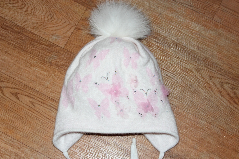 Шапочка молочного цвета, состав: шерсть 50 %, ангора 350 %, полиамид 15 %, подклад-микрофлис, помпон -натуральный мех, на завязках, Daniil@ Daniela, р 50-52