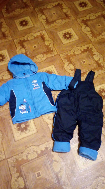 Зимний комплект (полукомбез + куртка), на возраст примерно от полутора до двух-трех лет (замеры по запросу), у п/комбеза длина лямок регулируется при помощи пуговок, длина штанин укорачивается/удлиняется засчет отворотов, также регулируется и длина рукава у куртки- экв.1500 руб
