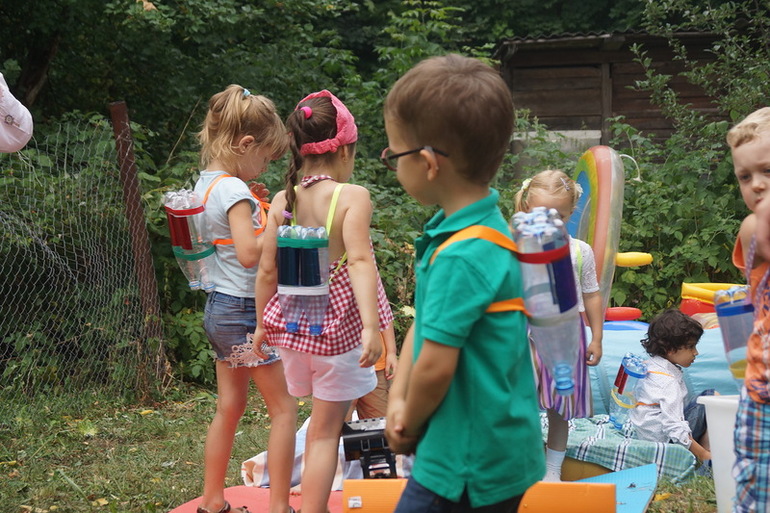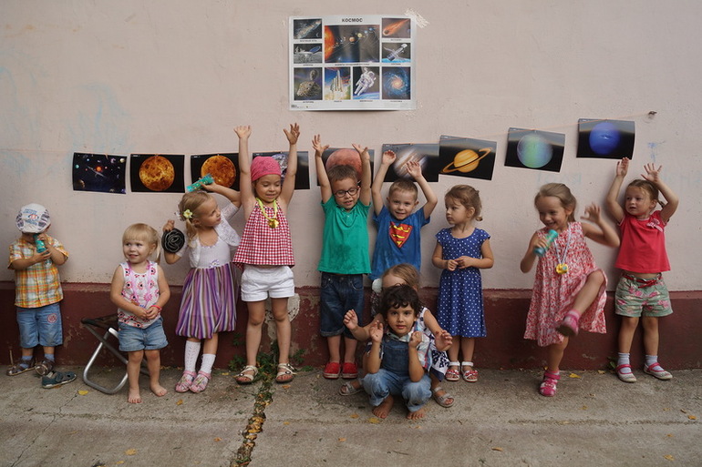 Когда все гости собрались, познакомились, рассмотрели вместе подарки и даже поиграли с ними, мы предложили всем вместе полететь в космос.