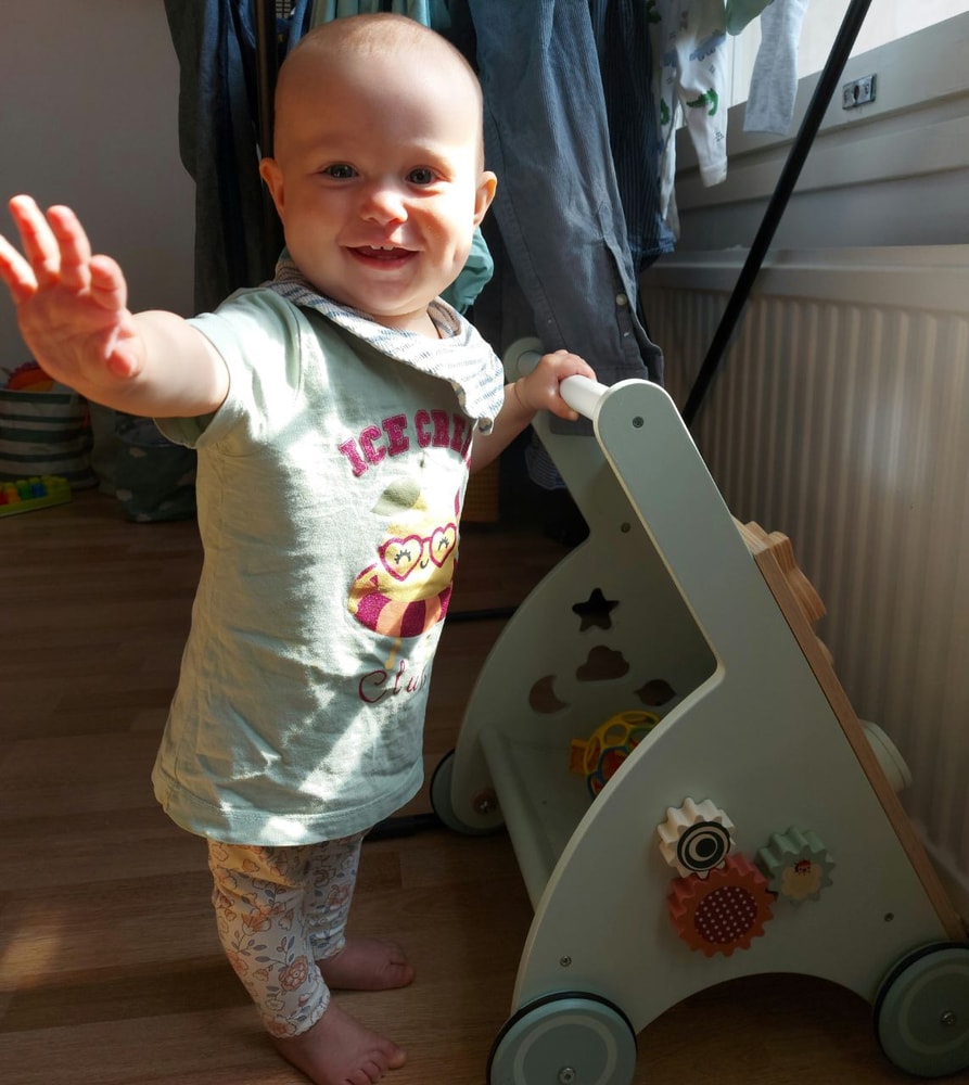 Запишу на память: мелкая полюбила стоять у опоры, теперь при любом удобном случае надо вскочить. Какие дети все же разные! Сын в этом же возрасте едва начал ползать по-пластунски, эту тележку мы купили ему, но интереса не было абсолютно 😁