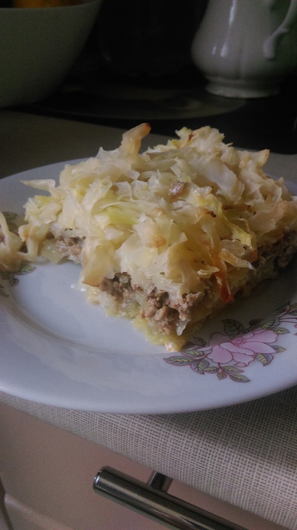 Вчера в ночи готовила капустную запеканку с говяжьим фаршем, поэтому фото темноватые.