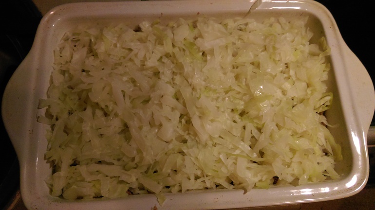 Далее раскладываем это все слоями в лоток, сначала половину капусты, фарш и оставшаяся капуста. Заливаем молоком, накрываем фольгой и в духовку на 30-40 минут при 180 градусах.