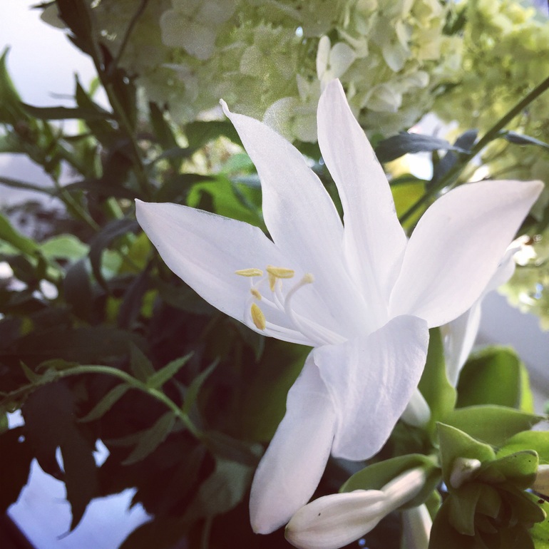НАСТРОЕНИЕпахнет Черным морем, потому что от родителей я привезла воскресный букет. Сегодня он белый и трогательный. Ромашка, гортензия и Крымская хоста. Последняя и виновата в вечернем запахе;)