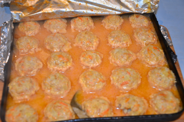 + 2 столовые ложки муки + соль. И залить тефтели. Закрыть фольгой и в духовку.Запекать где-то минут 50-60 мин. при 180- 200С.