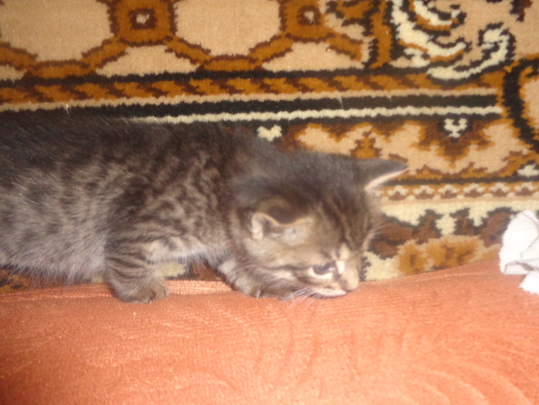 Вот такой малыш появился у нас дома))) Мальчик. Имя пока не придумали. Мяконький и очень ласковый! Два дня все маму искал, но теперь освоился и бежит ко мне - думает, что это я его мама. Кушает мало... Даю сметану, молоко он не хочет. Он пока не понимает как кушать из миски, я его кормлю с пальца. Потом буду давать творог, яйцо, потом переведу на фарш, а следом - на общий стол. Решили вискасом не кормить.