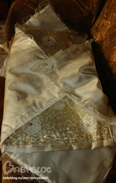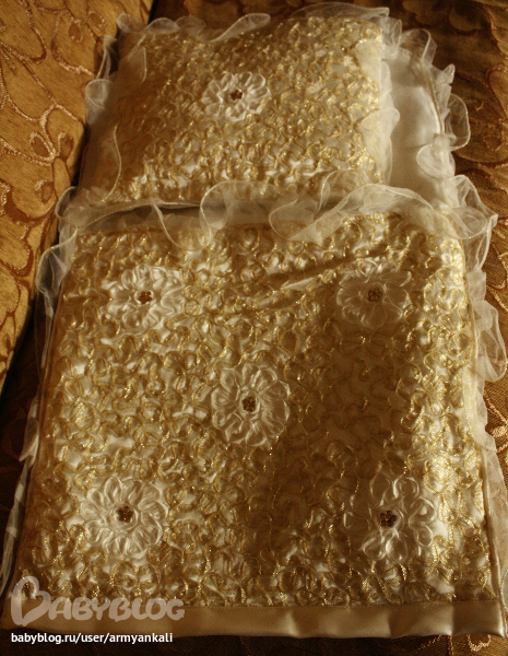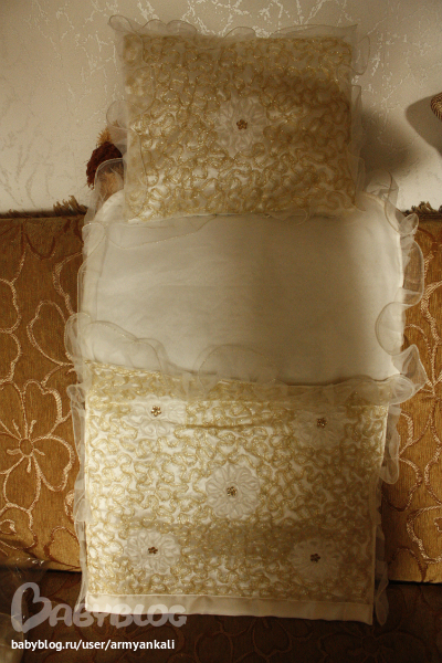 в комплектеПОДУШЕЧКА ОДЕЯЛЬЦЕ И КОНВЕРТ.Снутри-синтепон.Все обшито золотом. Очень красиво!!!