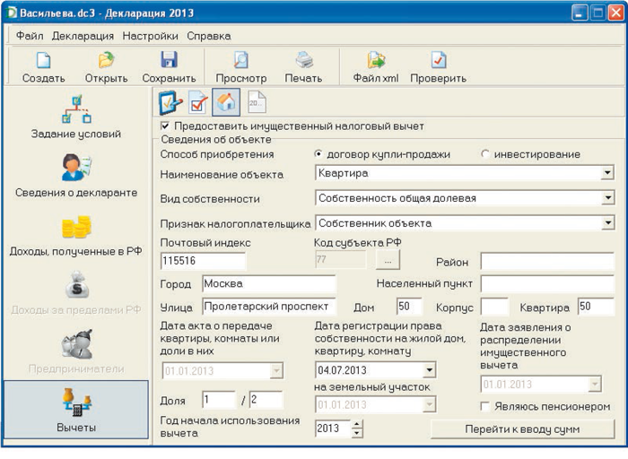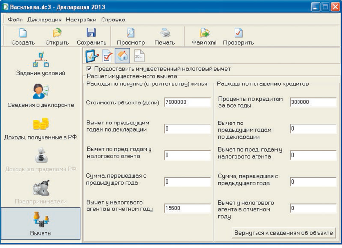 Здесь надо поставить галочку «Предоставить имущественный налоговый вычет», заполнить данные об объекте, по которому заявляют вычет (см. рис. 3). А затем нажать на кнопку «Перейти к вводу сумм». В новом окне надо записать расходы на покупку жилья и сумму потраченных процентов, если «физик» взял ипотеку (см. рис. 4). Здесь же надо ввести сумму имущественного вычета, которую «физик» получил за предыдущие годы и в текущем году у работодателя. В этой вкладке надо заполнить только вычеты на покупку жилья. Вычеты, которые положены при продаже имущества (не более 1 млн рублей или в размере расходов), заполняют в разделе «Доходы, полученные в РФ» одновременно с доходом от продажи жилья (код дохода 1510).