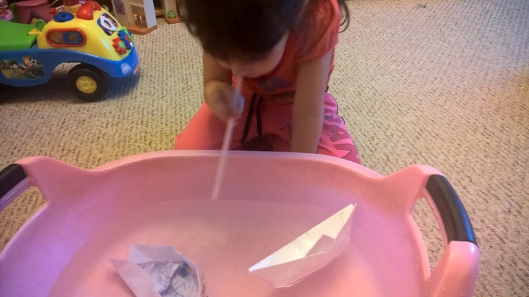 В классический вариант игры Алина играть не захотела. Зато с водой в тазу забавлялась целый час! Мы и просто кораблики пускали, и дули на них из трубочки, и бросали камешками.