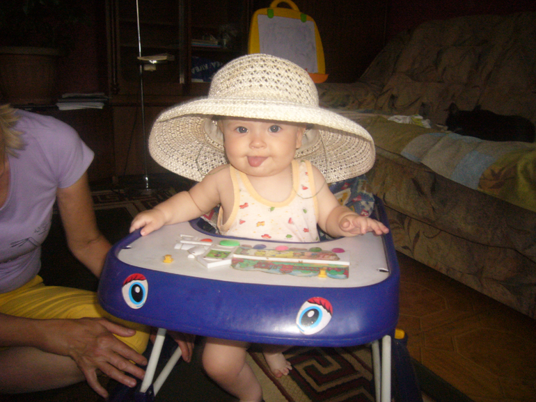 Умеем сидеть, вставать у опоры, ползать на коленках, садится на попу из положения "на коленках", гоняем в ходунках.