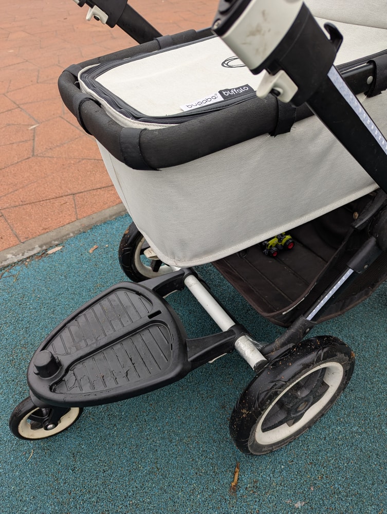 Делюсь лайфхаком. Вдруг кому-то тоже пригодится. Мне досталась подножка старого образца от знакомых, они коляску давно продали, подножка валялась на даче, и они ее отдали нам. А мне актуально: у меня дети с разницей 2,5 года и Bugaboo Buffalo. Адаптеров именно к этой подножке я нигде не нашла. Всея Авито перерыла - ну нету... И один очень добрый и находчивый человек мне подсказал взять сантехническую трубу 25 мм - на нее подножка идеально садится и защелкивается замочками. А дальше уже все просто. Я закрепила трубу банально скотчем на раме. Нагрузку держит отлично, если не жалеть скотча, мы проверили, и выглядит вполне в бугабушном стиле. 😊 С моей люлькой Ательер вообще как родная эта труба.