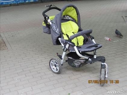 Состояние на 3. Много уже недочетов. Потерялся один наплечник, на чехле на ножки у одной молнии потерялась собачка. Ручной тормоз не работает. Корзинка для покупок немного поистрепалась. В комплекте вкладка для малышей, дождевик (не рваный).