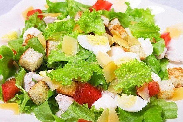 4. Разбейте яйцо на салат, перемешайте. Посыпьте пармезаном, добавьте сухарики и кушайте на здоровье!