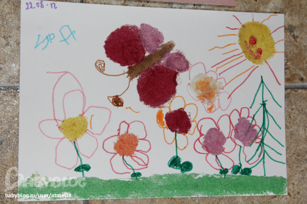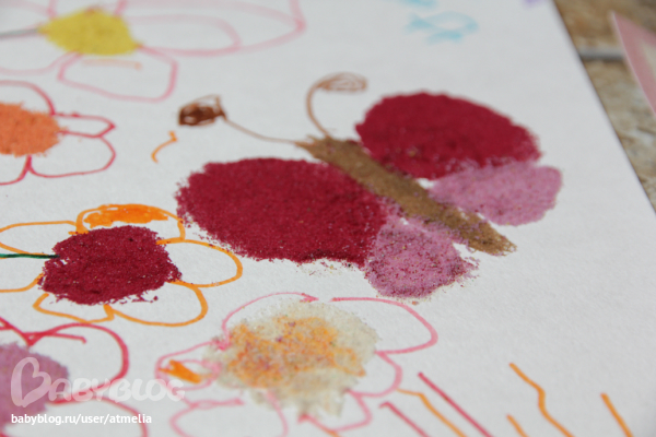 После у нас осталось много разноцветного песка и мы его тоже пустили в дело)По той же схеме, только липкий слой создавали клеем, Ира рисовала простейшее и засыпала песком)