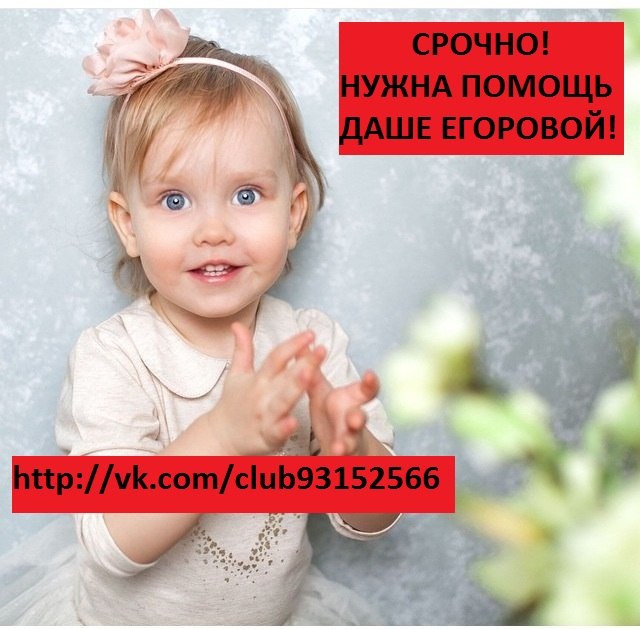 Друзья! Мы всегда надеемся на то, что беда обойдет наш дом стороной. Но, к сожалению, иногда так не случается. Маленькой девочке - Даше - СРОЧНО нужна наша помощь. 13 июня девочке будет 2 года. Всего лишь два годика, а у нее уже такая беда… Обо всём по порядку: месяц назад Даша неожиданно начала часто болеть - сначала простуда, потом стоматит, отит и вдруг неожиданно поведение Даши поменялось. Активная не по годам развития (в свои 2 года она уже рассказывает стихи, знает цвета, рассуждает вслух) Даша внезапно начала отключаться во время игр, при этом не теряя сознание, а просто, как будто засыпая на миг, не реагируя на происходящее вокруг: ни на мамин голос, ни на что. Буквально через 10 минут Даша открывает глаза, но будто бы ничего не помнит, не отвечает на мамины вопросы: «Даша, как ты? Что болит?», она продолжает играть. Мама и папа сразу же обследовали девочку от и до, но врачи не могли поставить точный диагноз, ссылаясь на разные причины: возраст, давление и т.д. Через некоторое время Даша уже впадала в это состояние по 3-4 раза за день. Родители уже били панику. Решились на МРТ головного мозга. И, Боже, диагноз… Он прогремел словно гром: опухоль левой весочной доли (диагноз поставлен в Нижегородской областной детской клинической больнице). Девочке всего два года, а она уже столкнулась с такой бедой! Врачи ставят родителей перед фактом: нужно срочно принимать решение - надо спасать маленькую девочку! И тогда они принимают решение ехать в Санкт Петербург 4 мая, а 5 мая их уже ждут на приём Детская больница 19 имени Раухфуза, где смогут попробовать помочь Даше, но, естественно, не за бесплатно. Первоначально необходим 1000000 рублей. Самим им такую сумму за короткий срок не собрать. Именно поэтому и нужна наша с вами помощь. Если мы поможем хотя бы по 100 рублей каждый, то сможем собрать сумму, если 11 000 человек откликнутся. Что такое 100 рублей - это полторы шоколадки, это минимальный проезд на такси, это треть коктейля в баре, НО в данном случае - это, возможно, целая жизнь. Не будьте равнодушны, давайте делать добро. Данные по карте папы Даши : Сбербанк 5469 4200 1615 1956 До 04/16 SERGEY EGOROV Так же вы можете передать деньги наличными родителям Даши.