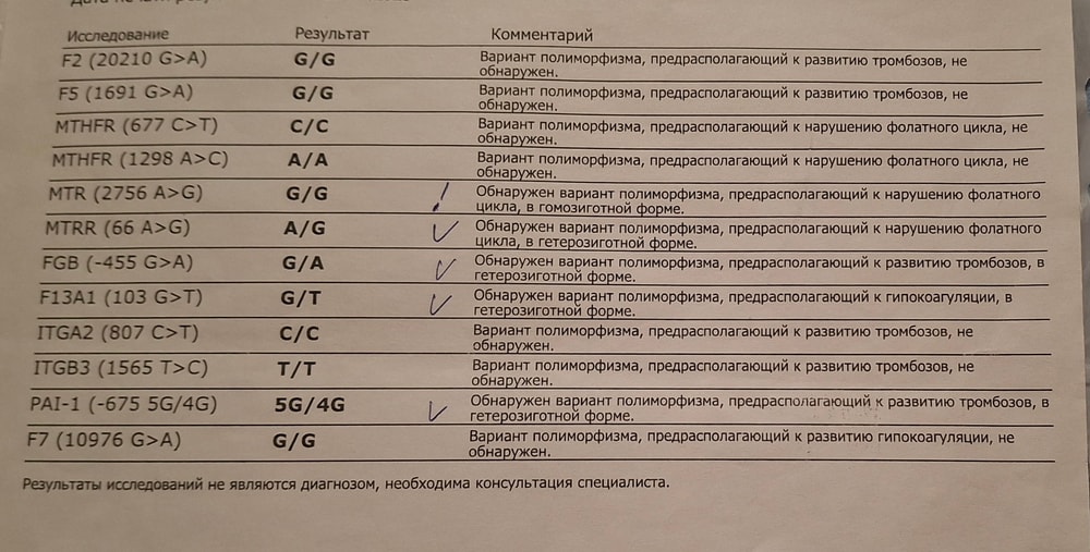 Также у вас есть гетерозиготная мутация по фактору 13, это риск кровотечений на гепарине. В вашем случае риск кровотечений ниже, так как фибриноген повышен.