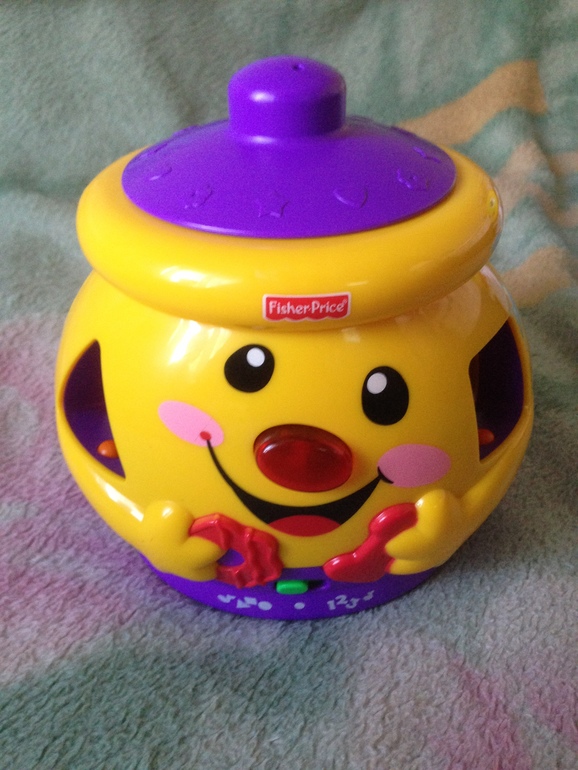 3. Горшочек-сортер от Fisher Prise. Мне игрушка не особо понравилась, какая-то она бесполезная. Сын быстро вкурил, что не надо искать по бокам, куда засунуть формочки, ведь можно просто открыть крышку и все туда свалить. И теперь только так и делает. Звуковое сопровождение приятное, но однообразное (2 песни и 10 штук предложений) и надоедливое очень. Но сыну нравится этот горшочек, а это главное. А вот как сортер, считаю, бесполезен.