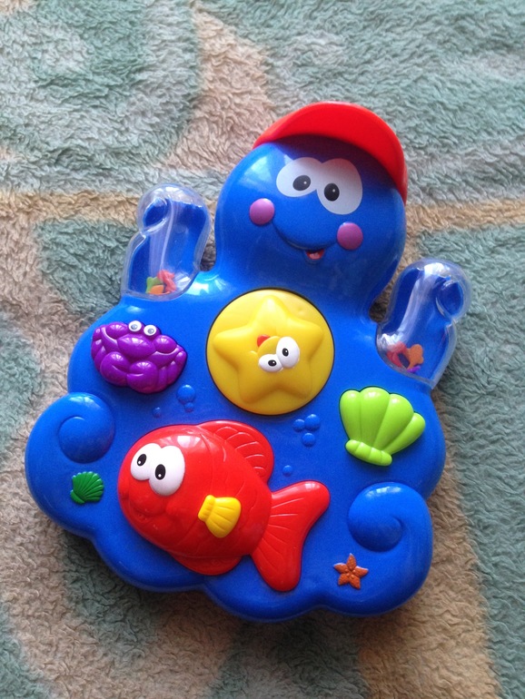 8. Игрушка для ванной. Какая-то неведомая фигня))) Опять же, в ванной не пробовали, но при рассмотрении, я в ней смысла вообще не увидела. Какая-то чушь. Ну или может она для деток поменьше. Потому что музыки/звуков нет, вся "соль" в поступлении воды в два отростка по бокам, там будут плавать маленькие пластиковые рыбки. Ну и простые кнопочки и звезда-вертелка. Короче, бесполезная игрушка, на мой взгляд.