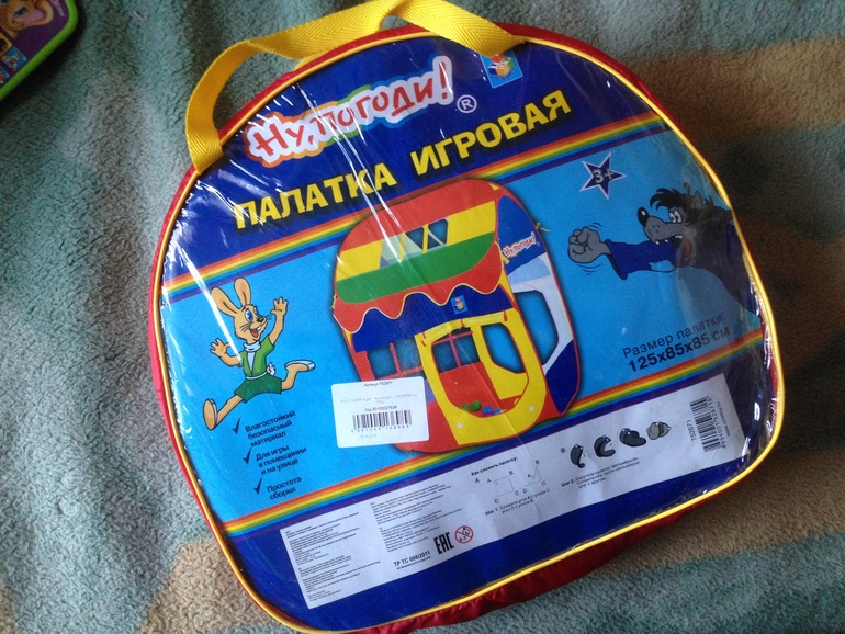 12. Домик-палатка "Ну Погоди!". Просто хит! Я ещё не успела её достать из чехла, сын уже начал сходить с ума. Прыгал вокруг меня, дергал за руки, чтобы быстрее дала ему. А когда расставили палатку, что началось... Ну просто экстаз у ребёнка!😂 Я даже и не подозревала, что реакция будет настолько ошеломляющей! Единственное, палатка 3+, тк не особо устойчивая. Точнее сказать, абсолютно неустойчивая))) Мелкий около минут 40 играл в ней (еле оттащила, спать надо было), и все это время я держала её. Сын бросался на стены, пытался скрутить, тянул, выглядывал из дверц - короче бесяч напал тот ещё. А вот как её в деревне ставить, я пока думаю, ведь если ветром не снесёт, то Саш в порыве радости перевернётся. Думаю, придумать какие-то утяжеления по углам внутри, чем, чтоб не ударился - пока без понятия.