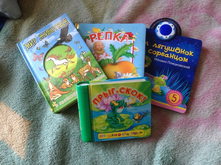 10. Книги. Подарили несколько антивандальных картонах книг со сказками. Одна книга с голосовым воспроизведением стихов из самой книги. Мелкому не нравится: включит, услышит и тут же скорее выключать. Другая книга со свистком-квакушкой. Свисток сразу был вытащен, и теперь мы в него дудим)) И ещё одна книга с "живыми" картинками. При переворачивания одной страницы, на другой начинает двигаться животное. Даже не знаю, как это объяснить, но это очень круто!