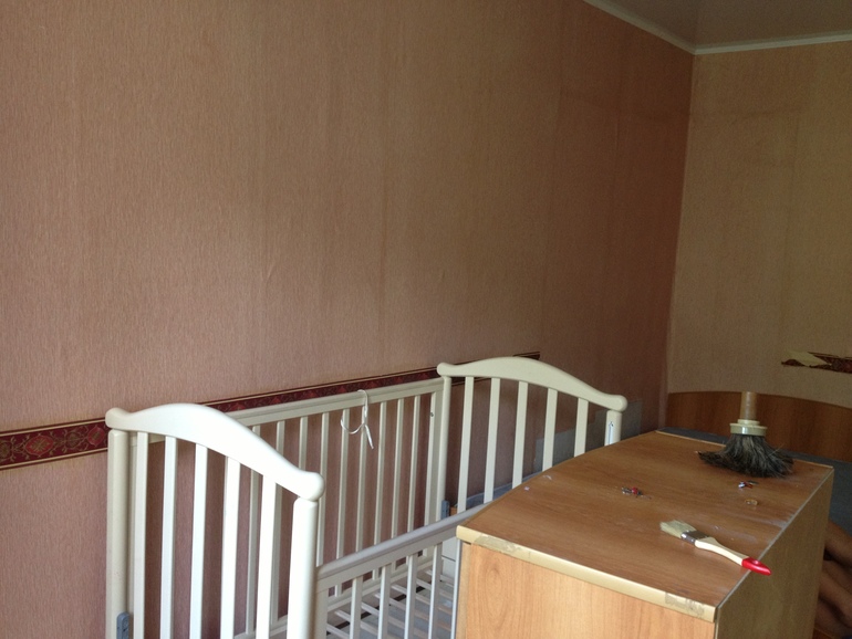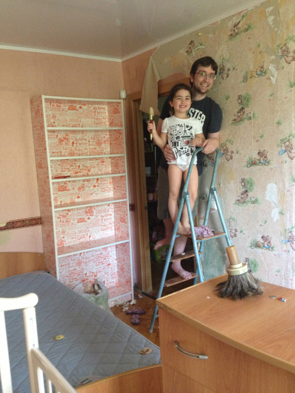 В общем в результате, пришлось подорваться, через час мы уже выбирали обои в Леруа. Приехали домой, ободрали старые обои (по совету моего папы, нужно было намочить тряпкой старые обои и тогда они отходили большими кусками), Ленок помогала! Потом мы с Леной уехали и мой муж, никогда до этого не занимавшийся всякого вида ремонтами с моим папой, который наверное уже не один км обоев наклеил обклеили комнату за день!