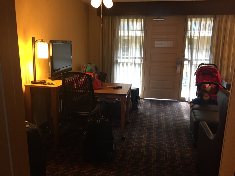 За несколько дней до начала нашего путешествия Ленок выдает температуру, отсиживаемся дома (хотя были планы в последние дни налопаться мороженки, потаскаться по ресторанам, напоследок;))). Температура слава богу была только один день. У Алиски к тому времени только сопельки подтекали, да и то это был уже день пятый, короче к завершению, сходили на нет уже. В ночь перед первым полетом, бесконечные чемоданы собраны, я пораньше ложусь спать и тут понимаю, что Алиска горячущая! Померили - 39. Хнычет, пытается уснуть под грудью, но на фоне резко поднявшейся темпы рвота, несколько раз и так нехило...ставлю свечку, темпа падает, спим. Через несколько часов просыпаемся несемся собираться и на выход. Алисик хоть и радостный, но с 38. Первые полтора часа полета капризничает из-за температуры, потом спит. Подлетая к Лос Анджелесу, ее так прокакало хорошо, что в туалете аэропорта пришллсь переодеть с головы до ног и чуть ли не выкупать в раковине, мне кажется что все так невероятно выглядело, что аж кто-то позвал уборщицу, которая тут же за нами стала намывать раковину, но так испачкаться и правда было редкостью, я тож в шоке была. Зато! Шутка ли, но температуру после этого как рукой сняло! Алиса бегала как электровеник по аэропорту, опрокинула коляску с собой прям у дороги (я чуть не поседела). Потом пока мы ждали на остановке пока за нами из отеля приедут она носилась у дороги так, что мне подумалось о приобретении не просто ошейника, а строго ошейника... Жесть сколько за утро накопилось энергии в такой маленькой плюшечке. Но радовало, что температуры больше нет и деть весел, хоть и непоседлив. Зато к этому времени закашляла Ленок, млин... В Лос-Анджелесе мы планировали пробыть целый день, но не выбираться из отеля, который находился неподалеку от аэропорта, поэтому взяли хорошенький отель с закрытым бассейном. Бассейном естественно не воспользовались. Сходили прогулялись до японского ресторанчика, потом свернули на детскую площадку недалеко от отеля. В ЛА не особо тепло в январе. Солнышка не было, как будто бы даже дождь, +16, но ветер, так что курток мы не сняли. Пляж был в 4х км от нас, но мы не стали в таких условиях туда рваться. Тем более в 5 уже темнеет. В нашем отеле в это время проводили комплимент приём для постояльцев. Ужином это не назовешь, но были начосы, картофельные чипсы, соусы (сврный, сальса), свежие овощи, попкорн, напитки, включая коктейли, короче было чем заняться;))) еще на территории отеля пруды с золотыми рыбками и черепахами. Кстати отель Embassy suites (3 зв) рекомендую, хороший варант передохнуть денек перед или после длинного перелета (надо себе его сохранить!). Все номера в отеле сьюты- 2комнаты (спальня и гостинная). Завтрак отличный.