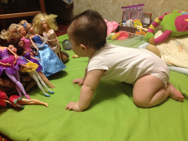 Сегодня Алисик стала вставать на четвереньки. Поднимает попу, а затем выпрямляет руки в локтях и стоит! Стоит качается, пока не завалится куда-нибудь (чаще всего вперед). А пока продолжает ползать по пластунски (из одного угла комнаты в другой - легко, если что-нибудь интересное увидит, на кроватях, диванах не оставляем, только в стульчике или на полу), переворачивается, лежит немного на спине и снова переворот! Лена до 8 мес вообще не ползала.