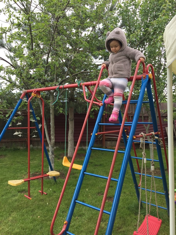 Алиска, мой маленький ураганчик! Наконец я стала видеть от нее обратную связь. Год и три. Наконец стала говорить хоть что-то кроме истеричных даааай и отдаааай! Теперь она произносит с демонстрацией "ПУПОК". Научила я ее случайно, ну вот показывала, повторяла. Она возьми да и повтори. Я воодушевленная еще и еще, она не отстает смотрит внимательно на мои губы и повторят!!! Пу-пооо, Пу-пооо!!! И пальцем тычет в пупочек. Вот сколько я билась с другими словами: мама, папа, daddy в конце концов... Ничего не вызывало интерес повторить. Ни какие ням-ням, кис-кис, мяу-мяу... А вот пупок понравился! Почти одновременно с пупком стала говорить "пока", но по-английски "bye-bye!", говорит "ба-бА!!!" И усиленно машет ручкой (всегда кстать правой и все делает правой, так что уверена будущая правша). Ручкой машет и провожает всегда в тему: прощаемся по скайпу с бабушкой/дедушкой, кто-то уходит, она сама уходит, например сваливает из комнаты машет бай-бай и захлопывает за собой дверь! Кроме того, наконец-то четко стала показывать нос, голову, ногу (правда все надо называть на английском - nose, head, foot. Но тут я сама инициировала английский, т.к. запомнить хэд (head) гораздо проще чем "го-ло-ва").