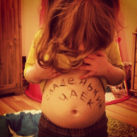 Это еще не конец истории))) Через месяц-полтора Янка, сидя на мне верхом, ковыряется в моем пупке))) А я её просвещаю))) Говорю:"Раньше ты жила у меня в животике"