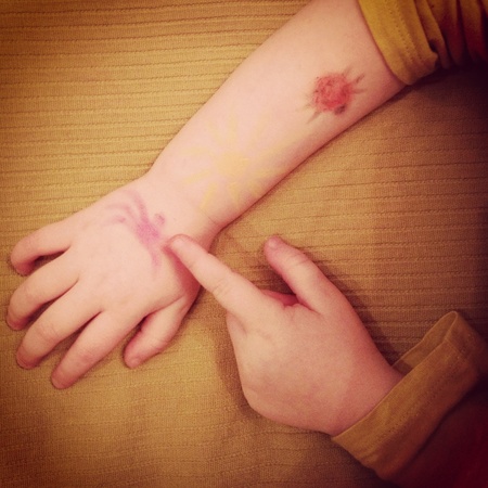 В последнее время часто называет себя тараканом))) Любит сказку про Тараканище Чуковского (знает всю наизусть))) Смешнючка))) Говорит про себя:"таакан сидит" или "таакан пойдет гуять" или "таакан напугаась"))) последнее слово переводится как "напугалась"))) Таракашечка моя)))) Надо же, каких злодеев Янка все время выбирает! Сначала волк, теперь вот таракан!))) Скоро и до Бармалея доберется)))