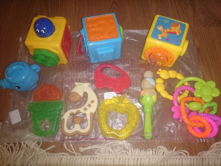 Прорезователи,погремульки,3 книжки, музыкальная палочка от бриджи старс еще от моей дочки))) морские жители мягкие (кто то шуршит,гремит итд)