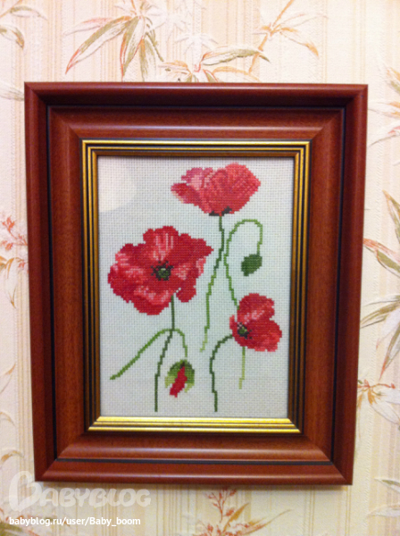 Эти маки вышивала очень давно, когда была еще студенткой (8 лет им точно,  если не больше). Набор подарила мне мама, ей на работе отдали, она мне несколько наборчиков и схем тогда принесла. На форумах по рукоделию в те времена не сидела и не знала, что надо закреплять нить, а не завязывать узелки.