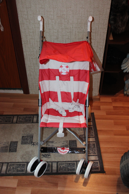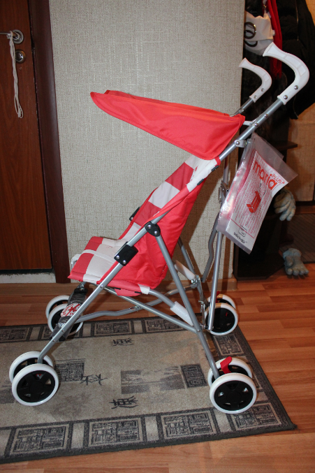 Двойные литые передние и задние колеса, тормоз-фиксатор. Коляска оснащена козырьком.