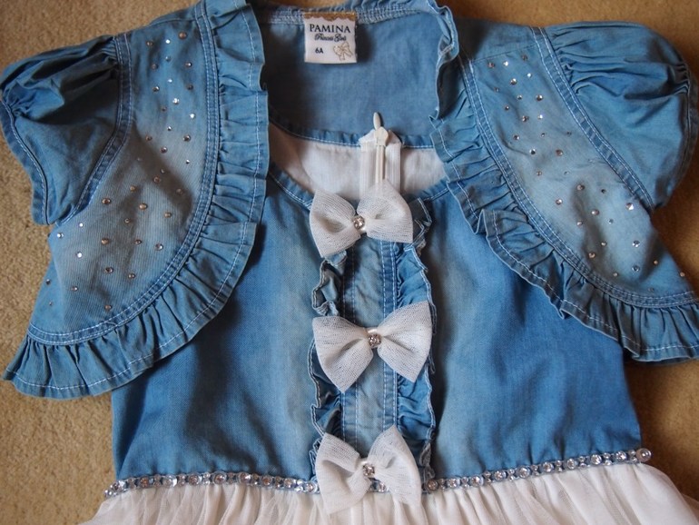 Надето 2-3 раза на праздники. Верх платья и болеро - тонкая джинса. Все стразы на месте. К телу - х/б подклад. От подмышки до подмышки 32 см., пройма рукава болеро 10 см*2, длина платья 64 см.