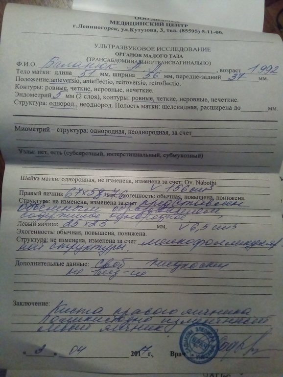 Девочки, обьясните, страшно ли это? Киста п.я. 67 мм,, а в левом поликистозное изменение.? Эндик ваще 5 ...Что это значит.