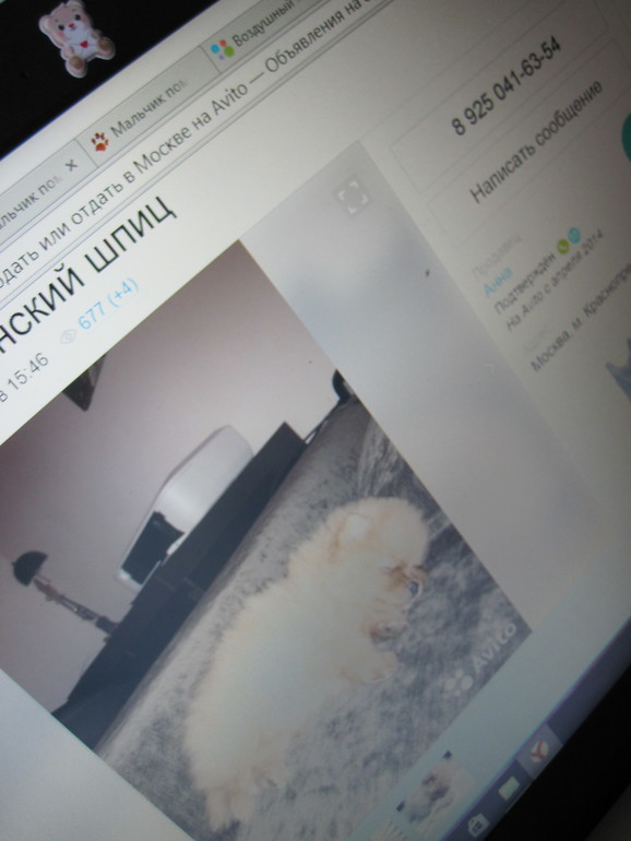 Друг2Находясь на даче я просматривала объявления на Авито по поводу продажи шпицев. Застав меня за этим просмотром, Ира сказала: "кончай перебирать фотки Афа" Я ответила, что это совсем не Аф, но объявление, что называется, "зацепило" Раз думаю, так похож на Афа, что даже Ира перепутала, то надо брать! И вернувшись в Москву, мы в первый же день созвонились с авторами объявления, а на второй день к ним поехала. Знакомиться. Со вторым Афом.