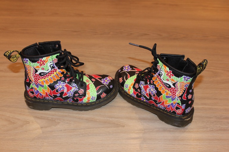 Разноцветные ботинки Доктор Мартинс 32 р., кожа, яркий принт, в идеале, не много повреждена подошва на каблучке, не видно совсем, когда одеты, 2500 р.