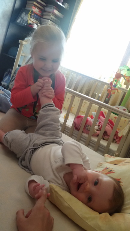Игрухи из руки в руку перекладывает, все ей интересно, на днях Кира ей полотенчики развесила с криками "Мама, смотри, Ева вся в занавесках", мелкая была счастлива, разговоров и лапомахов по полотенцам на полчаса хватило)) Вообще Кира ее сильно развлекает конечно, к обоюдному удовольствию, уже очень заметно, что Ева ее выделяет.. А Кира все ждет, когда "Ева подрастет, и я ее буду учить ходить за ручки"