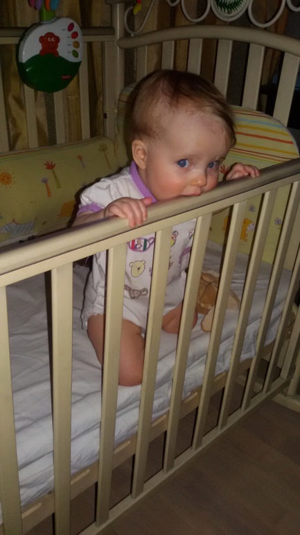 Спит по-разному, но в среднем обычно два сна. Днем только в кроватке, так как просыпаясь, быстро пытается уползи, стремно... Ночью иногда с нами, но тогда только в центре, чтоб не свалилась. Может часа в 3-4-5 проснуться и на час завести веселую беседу в голос)