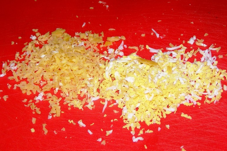 Затем поставим на огонь кастрюлю с яйцами - пусть варятся. Нам надо сочинить начинку для скумбрии. Это будет натертый на средней терке (чтобы не мелко и не крупно) сыр и измельченное яйцо.