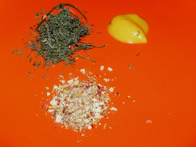 Чтобы начинка не была пресной, несмотря на присутствие сыра, давайте продумаем, чем все это сдобрить. Вариантов множество - начиная от смесей ароматных трав и кончая сметанной заправкой. У меня был сушеный укроп (если будет свежий, это только приветствуется!), специи и горчица (ингредиенты можете варьировать на свое усмотрение). Отмерьте всего понемногу, как на фото.