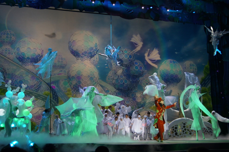 шоу афигенное! большая территория, валом аттракционов, мы ходили ... глазели... дурачились, рыбу ловили)) бесплатное шоу маша и медведи нас не впечатлило, и макс не стал смотреть))) ушли, а потом началось ОНО... действо! я смотрела с точки зрения дизайна и костюмов :-) ну.... профессиональное это!